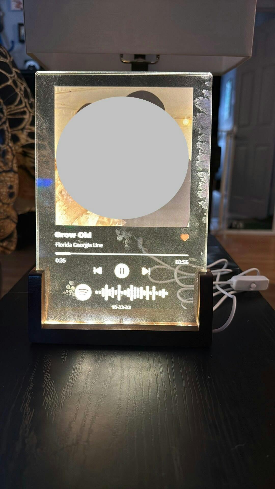 This was sent to us as a gift with a picture from our wedding & our song. Everything printed on the acrylic was not crisp like the printer was bleeding or something. It looked blurry. The song was wrong, it was supposed to be Florida Georgia Line but the song that came up when scanned was One Direction. There was damage on the acrylic like feathering or something. It looks like there’s like frost on the back.