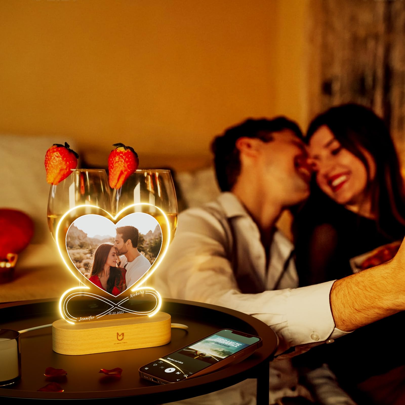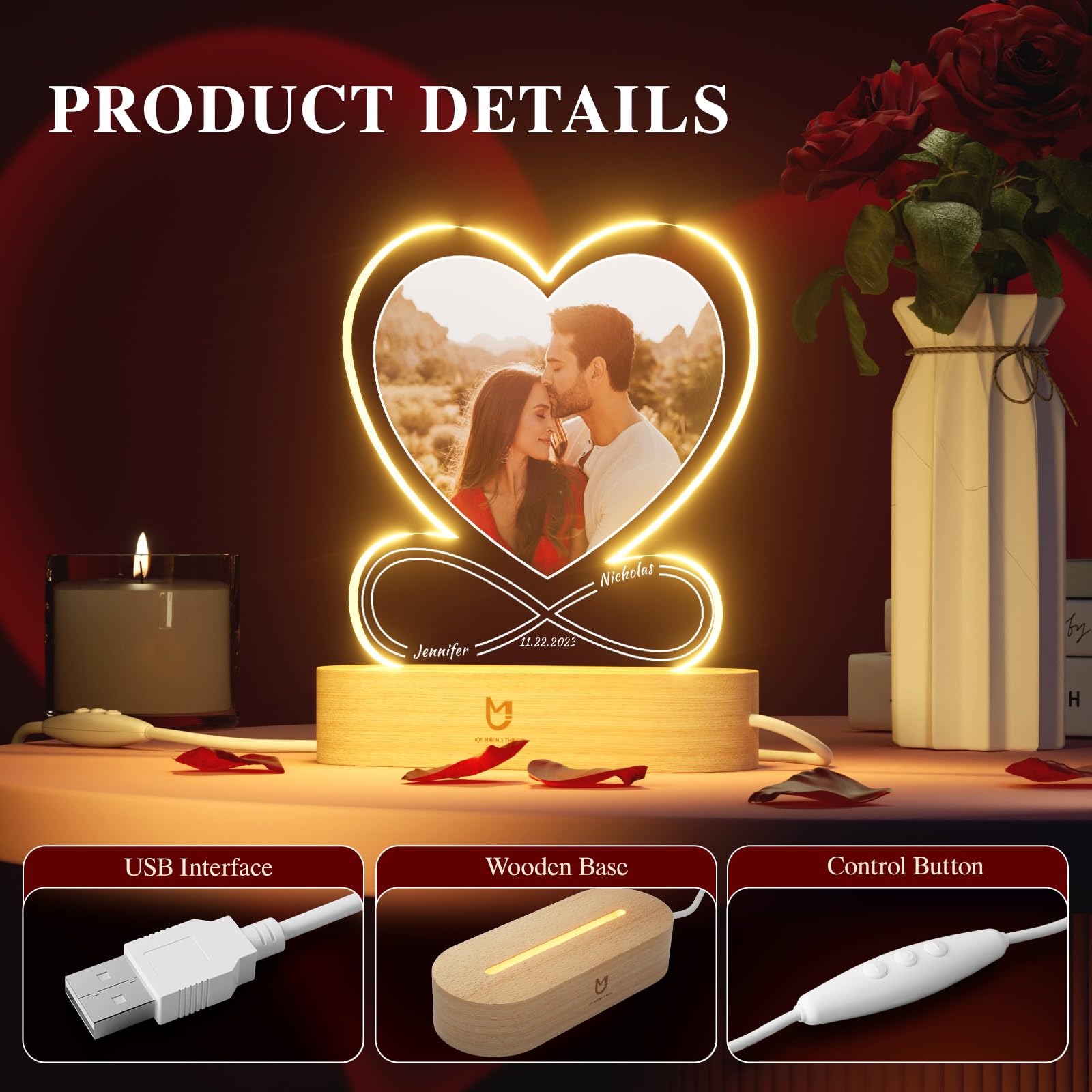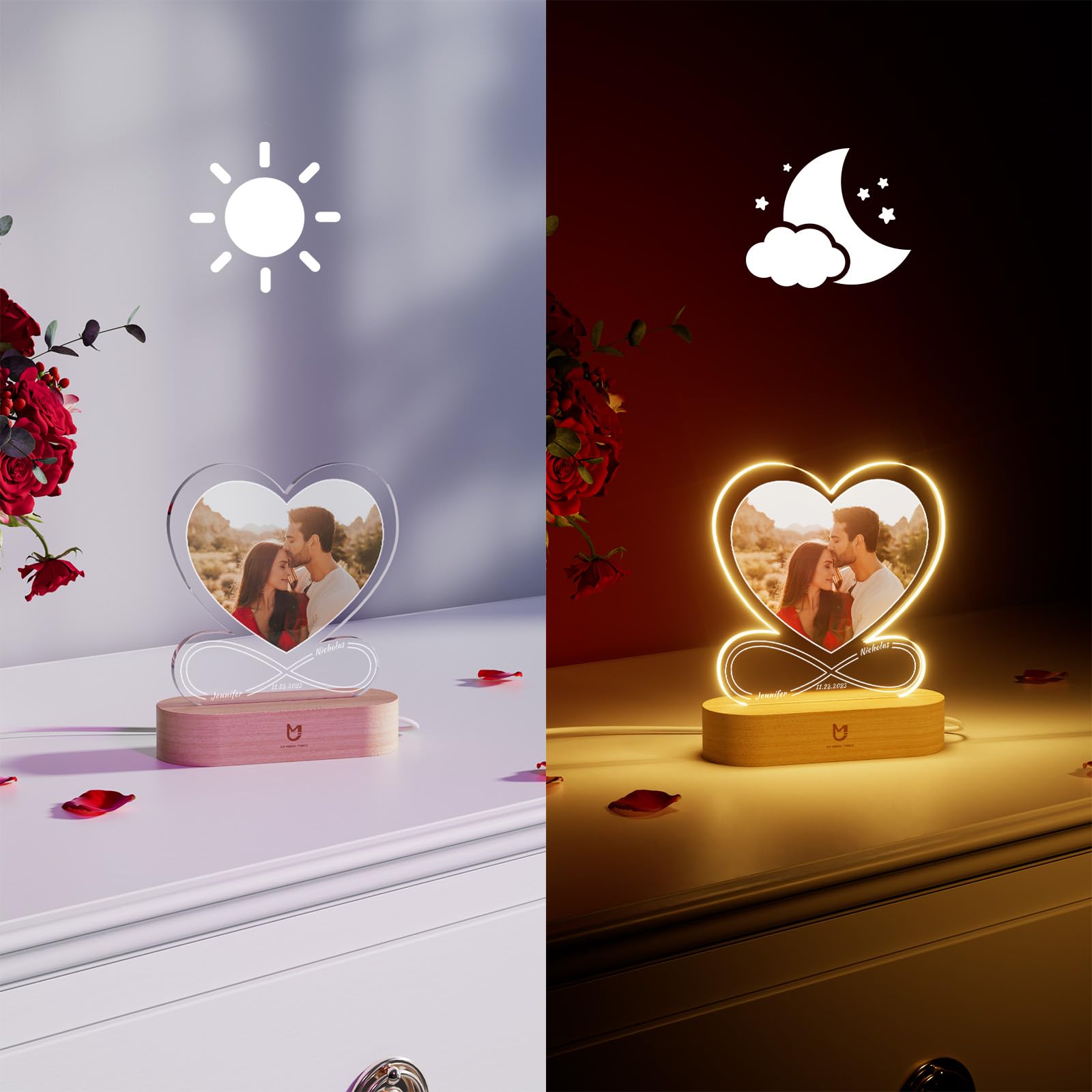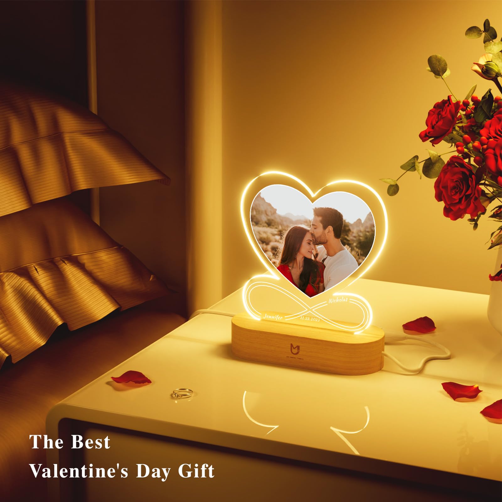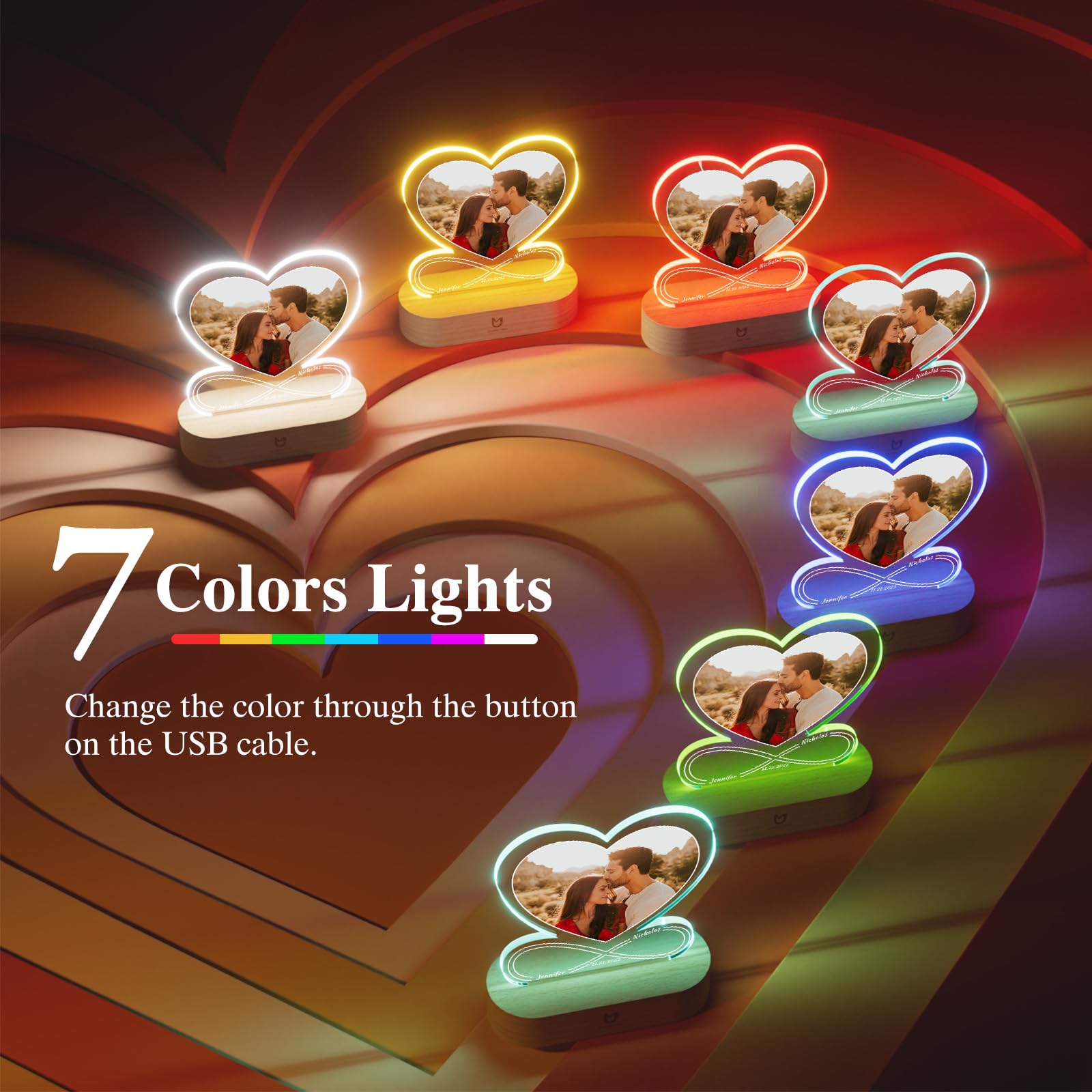 - CUSTOMIZED GIFTS LOVE LAMP: Customize heart light with your favorite photo and text to capture this beautiful moment. This lamp of love includes a photo frame and an optional LED stand with various lighting choices. The radiant glow of love from customized gifts will accompany your loved one forever