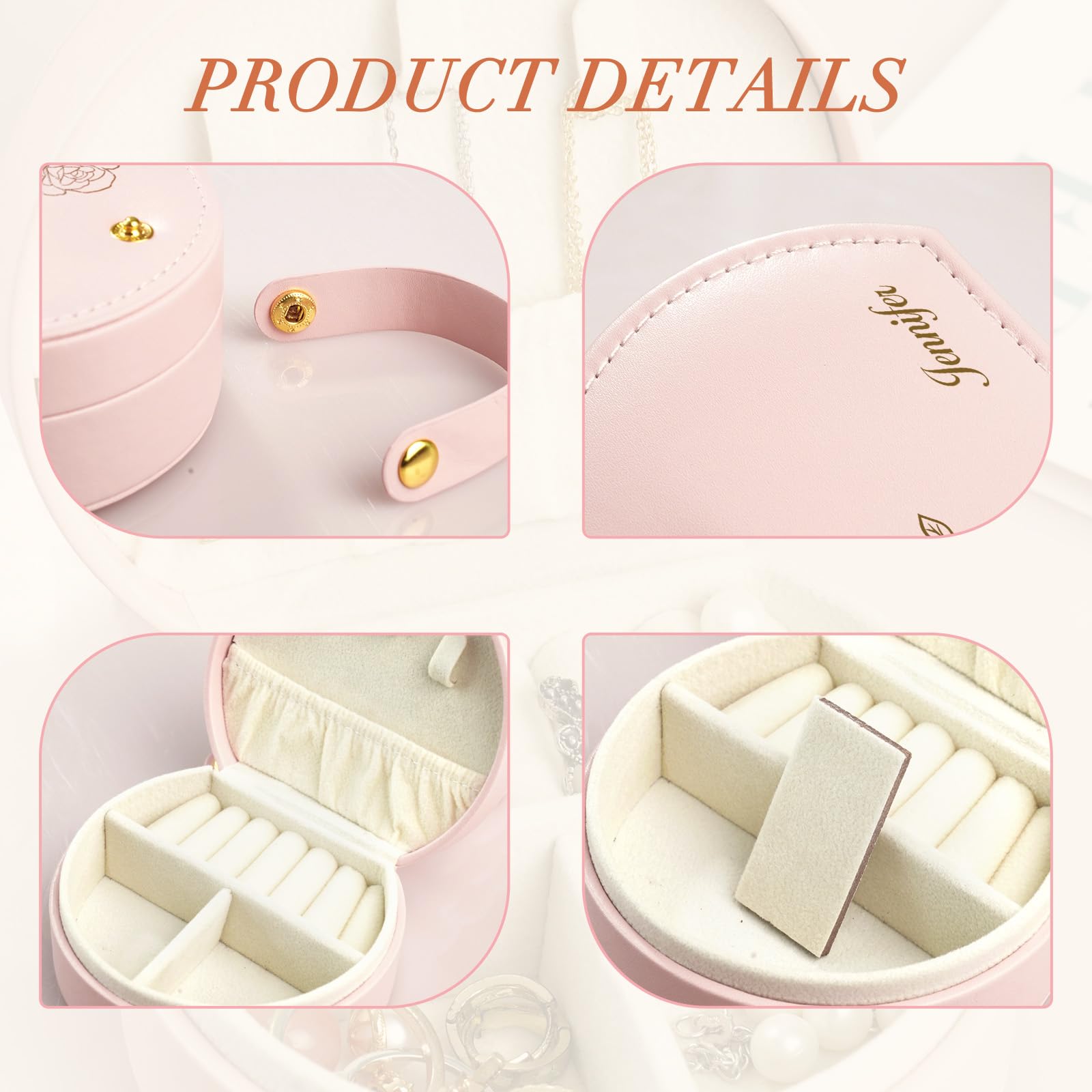 - 🧳MULTIFUNCTIONAL STORAGE🧳Personalized jewelry box you will find necklace hooks to hang your necklaces perfectly, elastic pockets for multiple uses and ring holders to organize your rings. Don't forget that the dividers are removable so they can be adjusted to your needs and favorite style. No more looking around for your jewelry or worrying about losing items when you travel!