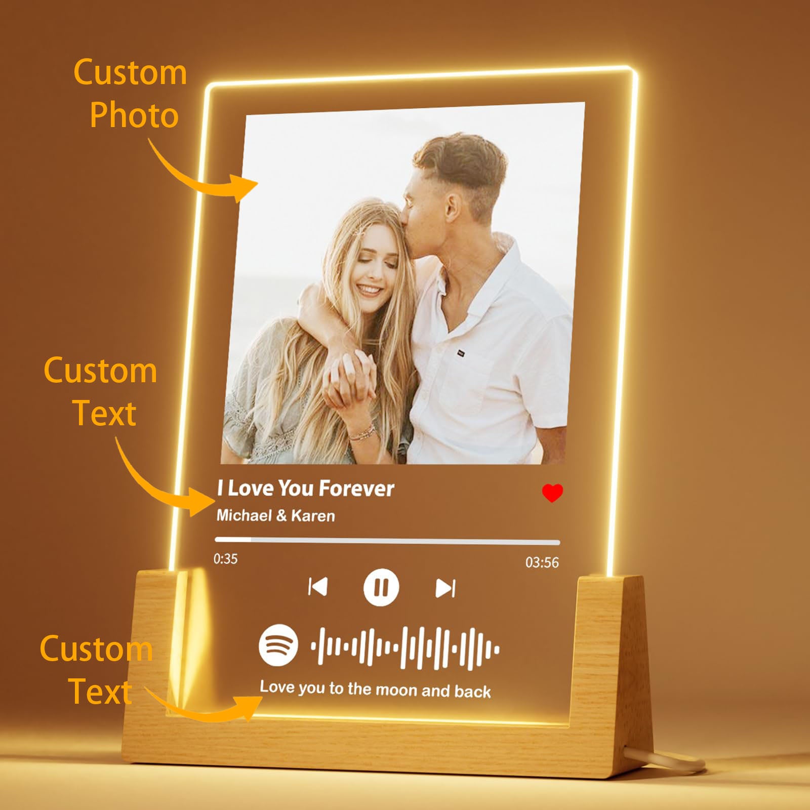 - PERSONALIZED NIGHT LIGHT WITH SPOTIFY: The wooden U-shaped base adds a touch of sophistication, with the option to choose different lights to decorate your custom music plaque. The warm and gentle light transforms this girlfriend-boyfriend gift into a personalized night light